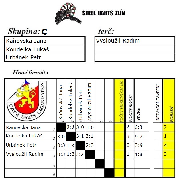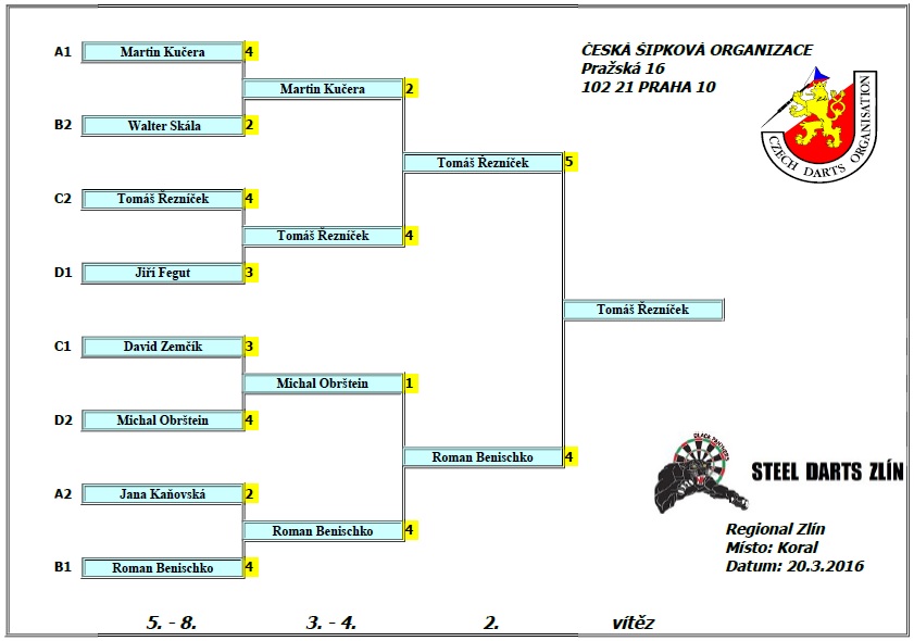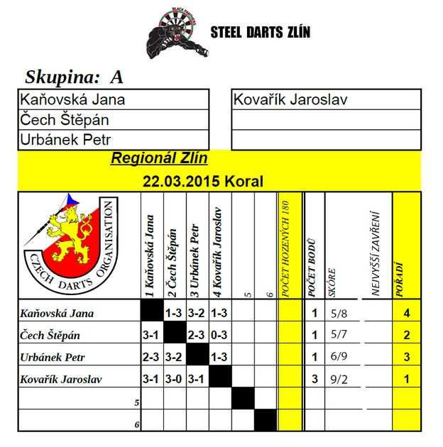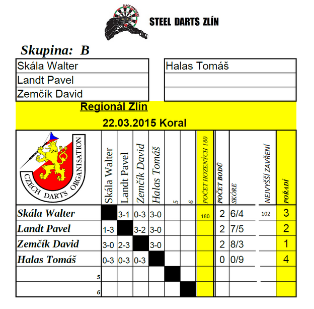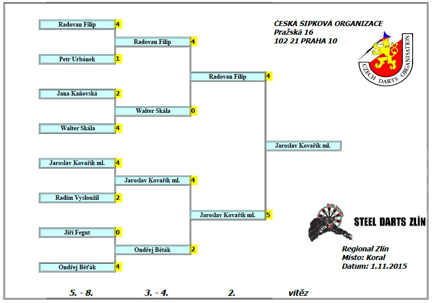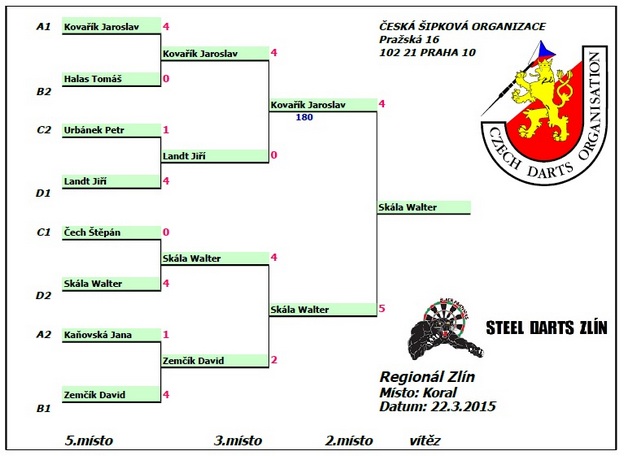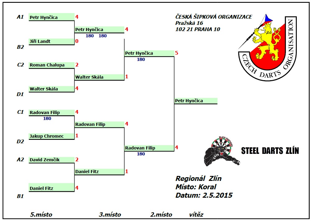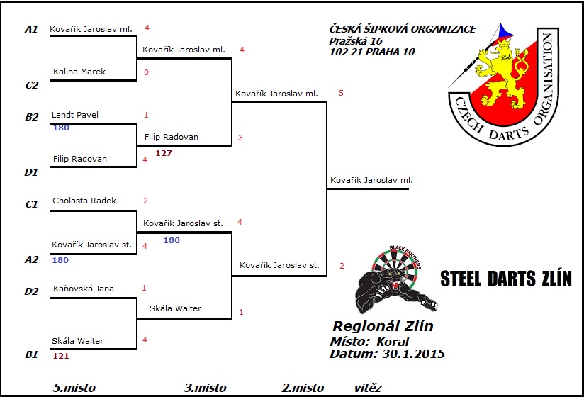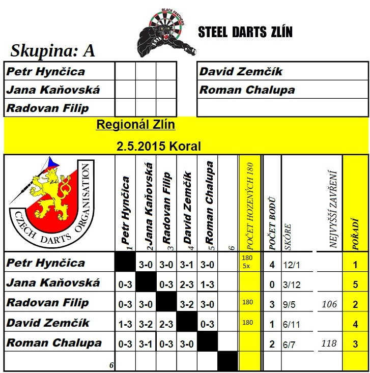 Čtvrtý Zlínský Regionální turnaj na Koralu je odehrán. Děkuji všem zúčastněným hráčům. Příští Zlínský Regionál bude opět na Koralu 11.7.2015. Sledujte stránky ČŠO www.czechdarts.org/ nebo naše stránky Black Panthers dc-black-panthers.webnode.cz/