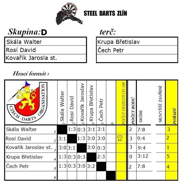 Historicky první Regionální turnaj na Zlínsku se opravdu vydařil. Děkuji všem zúčasněným hráčům. Termín příštího Zlínského regionálu ještě není pevně dán. Sledujte stránky ČŠO www.czechdarts.org/ nebo naše stránky Black Panthers dc-black-panthers.webnode.cz/ . Termín s pozvánkou se na nich objeví v dostatečném předstihu.