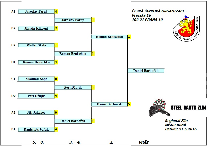 Čtvrtý Zlínský Regionální turnaj na Koralu je odehrán. Děkuji všem zúčastněným hráčům. Příští Zlínský Regionál bude opět na Koralu 11.7.2015. Sledujte stránky ČŠO www.czechdarts.org/ nebo naše stránky Black Panthers dc-black-panthers.webnode.cz/
